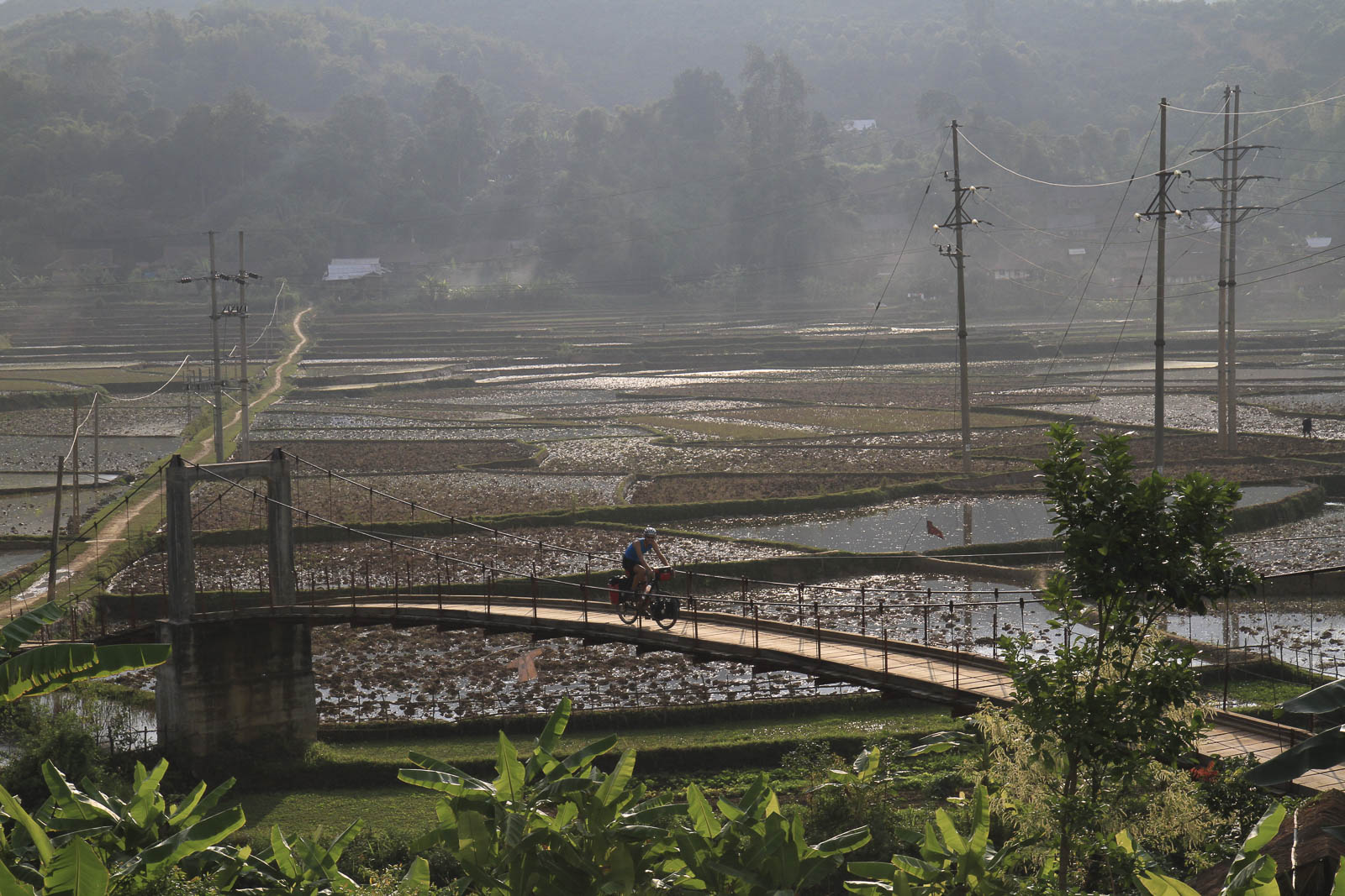 Route 6 bracht ons via een ‘scenic drive’ naar de grens met Laos. Onderweg fietsten we door verschillende White & Black Thai villages. Vooral de dames van deze bergvolkeren zijn hier nog traditioneel, en bijzonder stijlvol, gekleed. Hun houding straalt trots en samenhorigheid uit. Het evenwicht tussen enerzijds toerisme en anderzijds het authentieke leven van de hill tribes is wel broos. Zo was in Mai Chau, een dorp dat door de Vietnamese overheid sterk wordt gepromoot voor toerisme, alle authenticiteit verdwenen.