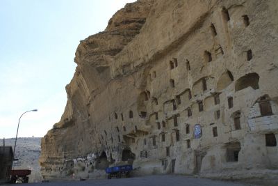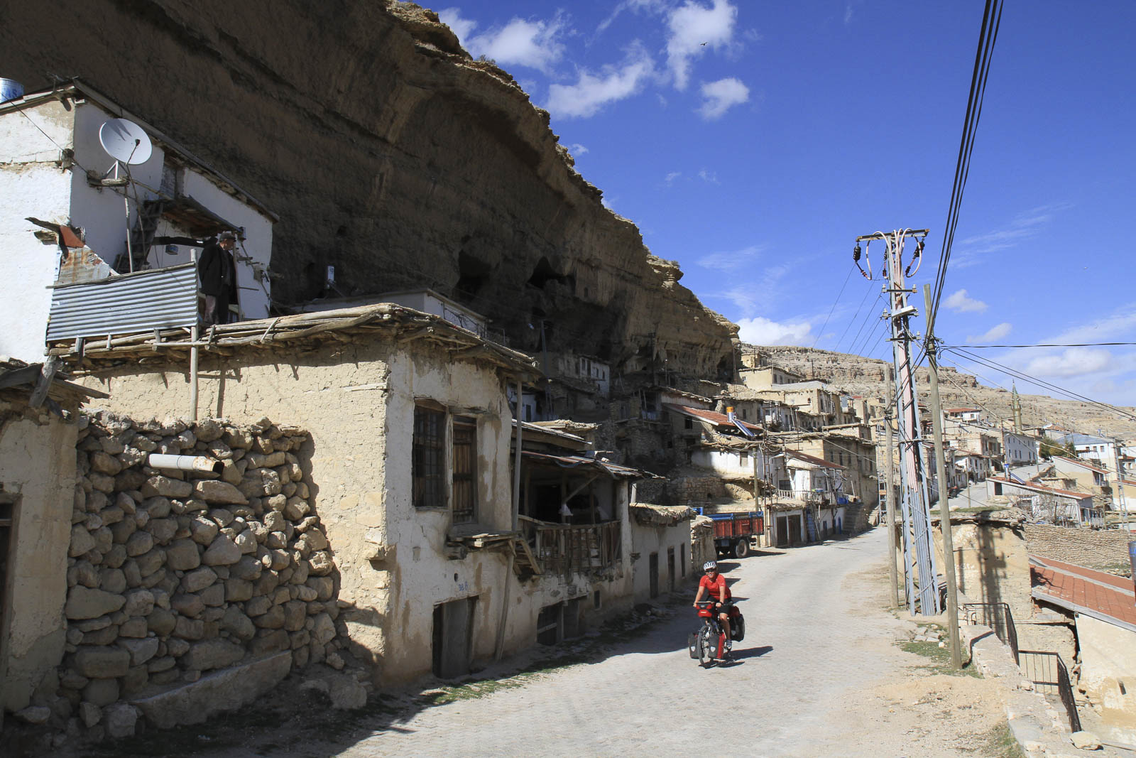 Ook de Turkse dorpstaferelen weten ons te charmeren. We voelden ons even avonturiers met een grote ‘A’ toen we in een godvergeten dorpje aanbelandden. Hier hadden ze nog niet veel westerlingen gezien, dachten we. Wim probeerde er ‘aan de mannen op het bankje’ met handen en voeten uit te leggen waar we vandaan komen en waar we naartoe fietsen (= het concept België) toen plots bleek dat dit eenvoudig in het Vlaams kon. Een van de mannen was een Turkse Belg of Belgische Turk die al 30 jaar in Deurne woont en op bezoek was in zijn geboortedorp. Hup, weg Avontuur. De sympathieke man leidde ons daarna wel met plezier rond in de Manazam ruïne, een tijdens het Byzantijnse Rijk uitgehouwen ‘kasteel’ in de rotsen.