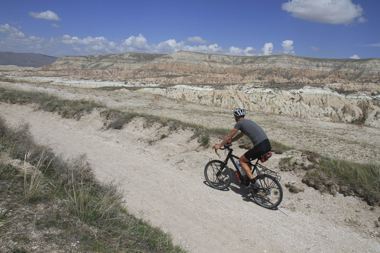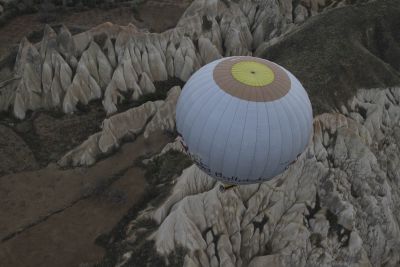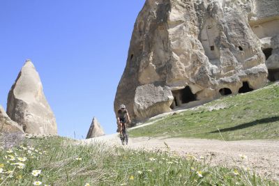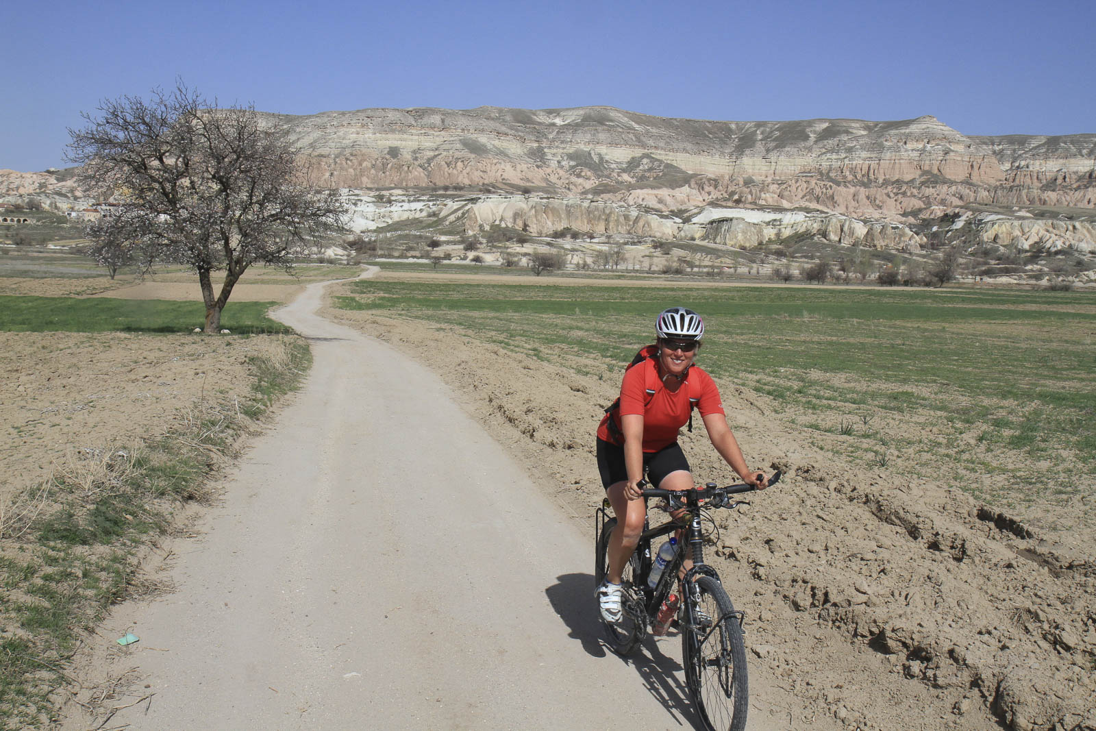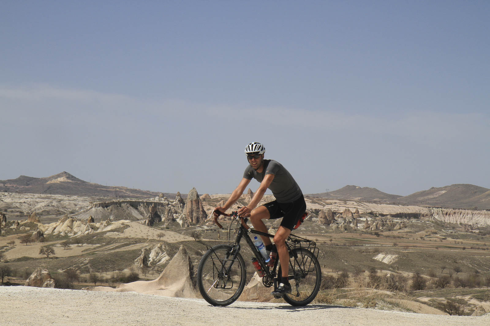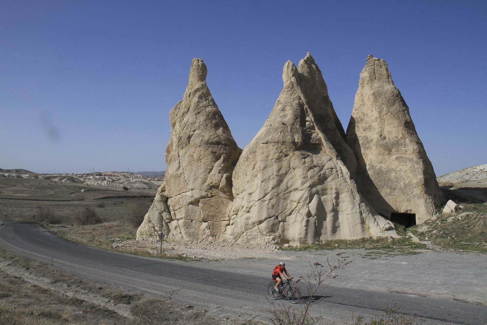 ‘I’m in a town called Cappadocia!’ zegt een Amerikaanse tourist in zijn gsm. Toegegeven, we zijn niet alleen in Cappadocië. Er lopen hier flink wat toeristen rond en blijkbaar kan niet iedereen het onderscheid maken tussen een streeknaam en/of een dorpsnaam. Als uitvalsbasis voor ons bezoek aan Cappadocië hadden we een prachtig gelocaliseerd ‘cave’-hotel in Göreme. We hadden er zicht op een feeëriek landschap dat vele millennia geleden door een vulkaanontbarsting en de nodige erosies werd gevormd. De rotsformaties zijn uniek en gevarieerd en een plezier om door te fietsen of te wandelen (of een combi van beiden aangezien wij nog al eens graag de fiets een wandelpad op sleuren). Het was er heerlijk toeven. We trakteerden onszelf bovendien nog op een ballonvaart zodat we het gebied ook vanuit de lucht in al zijn glorie konden aanschouwen.