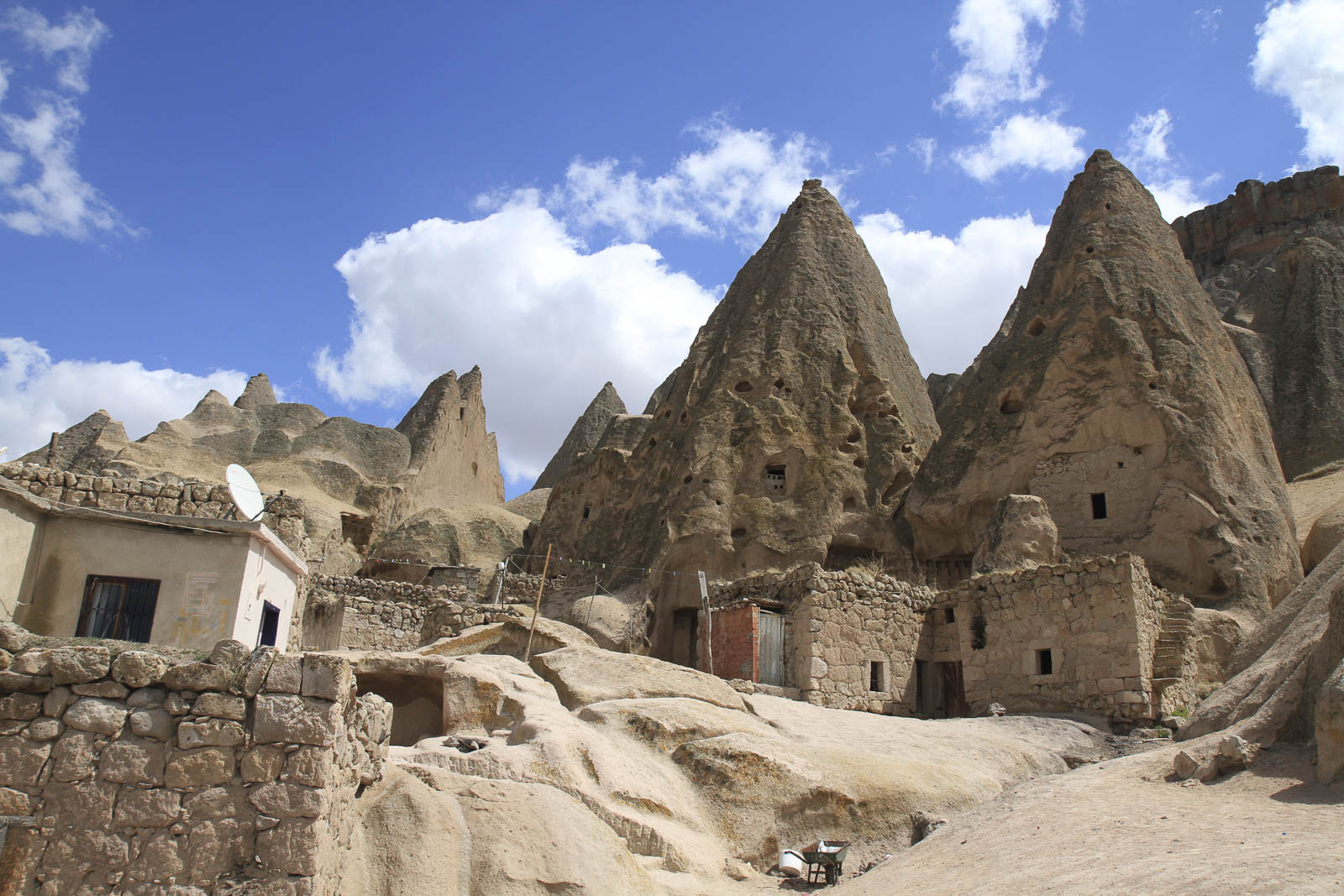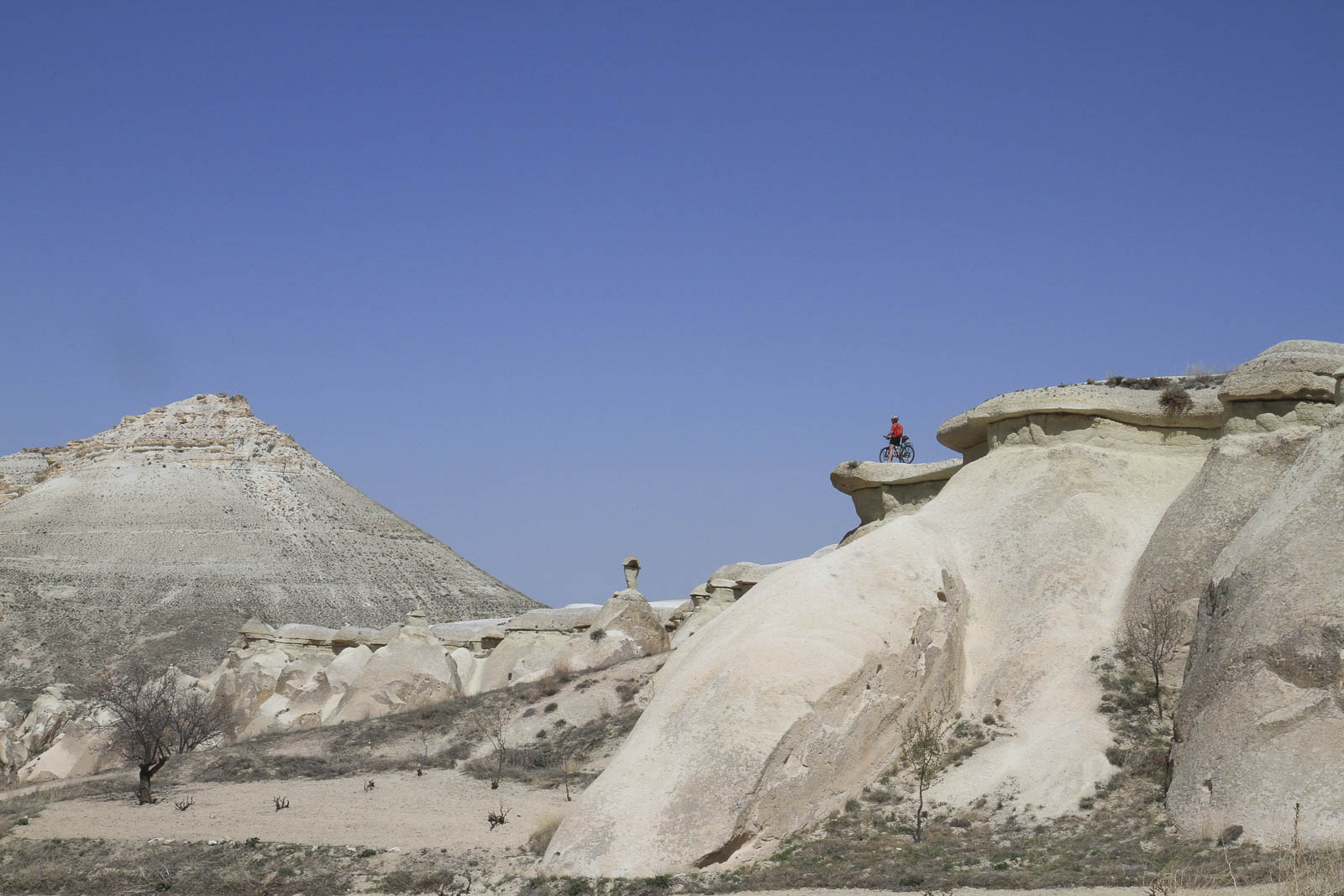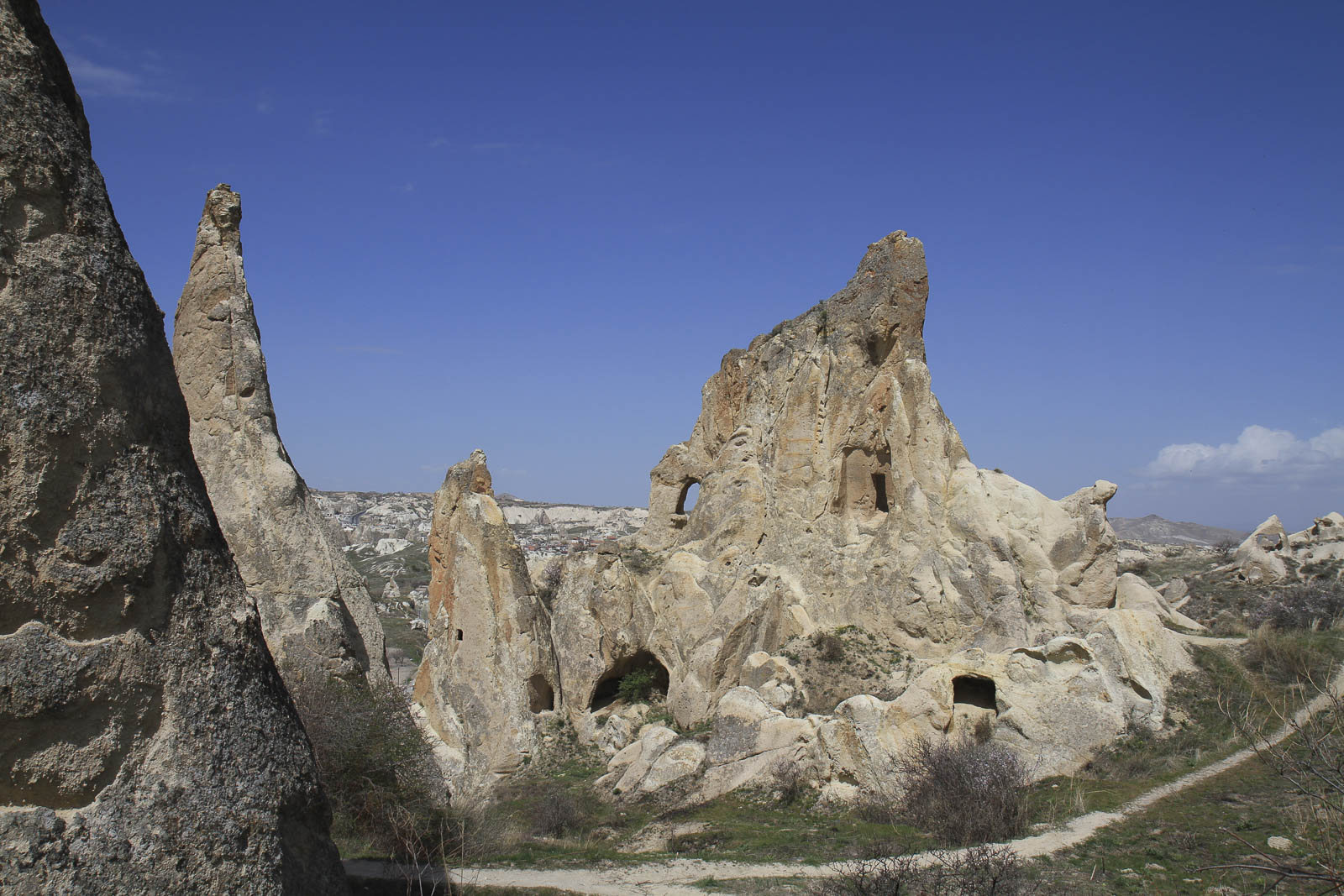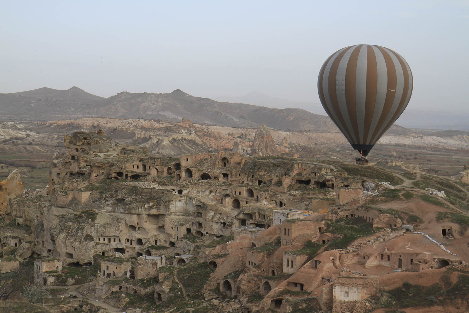 ‘I’m in a town called Cappadocia!’ zegt een Amerikaanse tourist in zijn gsm. Toegegeven, we zijn niet alleen in Cappadocië. Er lopen hier flink wat toeristen rond en blijkbaar kan niet iedereen het onderscheid maken tussen een streeknaam en/of een dorpsnaam. Als uitvalsbasis voor ons bezoek aan Cappadocië hadden we een prachtig gelocaliseerd ‘cave’-hotel in Göreme. We hadden er zicht op een feeëriek landschap dat vele millennia geleden door een vulkaanontbarsting en de nodige erosies werd gevormd. De rotsformaties zijn uniek en gevarieerd en een plezier om door te fietsen of te wandelen (of een combi van beiden aangezien wij nog al eens graag de fiets een wandelpad op sleuren). Het was er heerlijk toeven. We trakteerden onszelf bovendien nog op een ballonvaart zodat we het gebied ook vanuit de lucht in al zijn glorie konden aanschouwen.