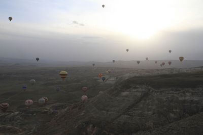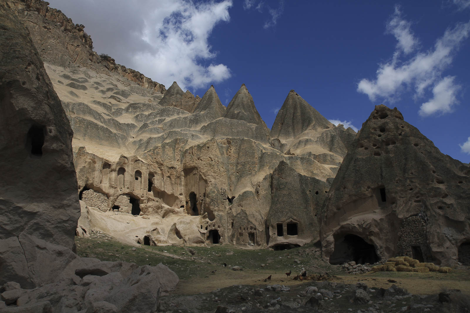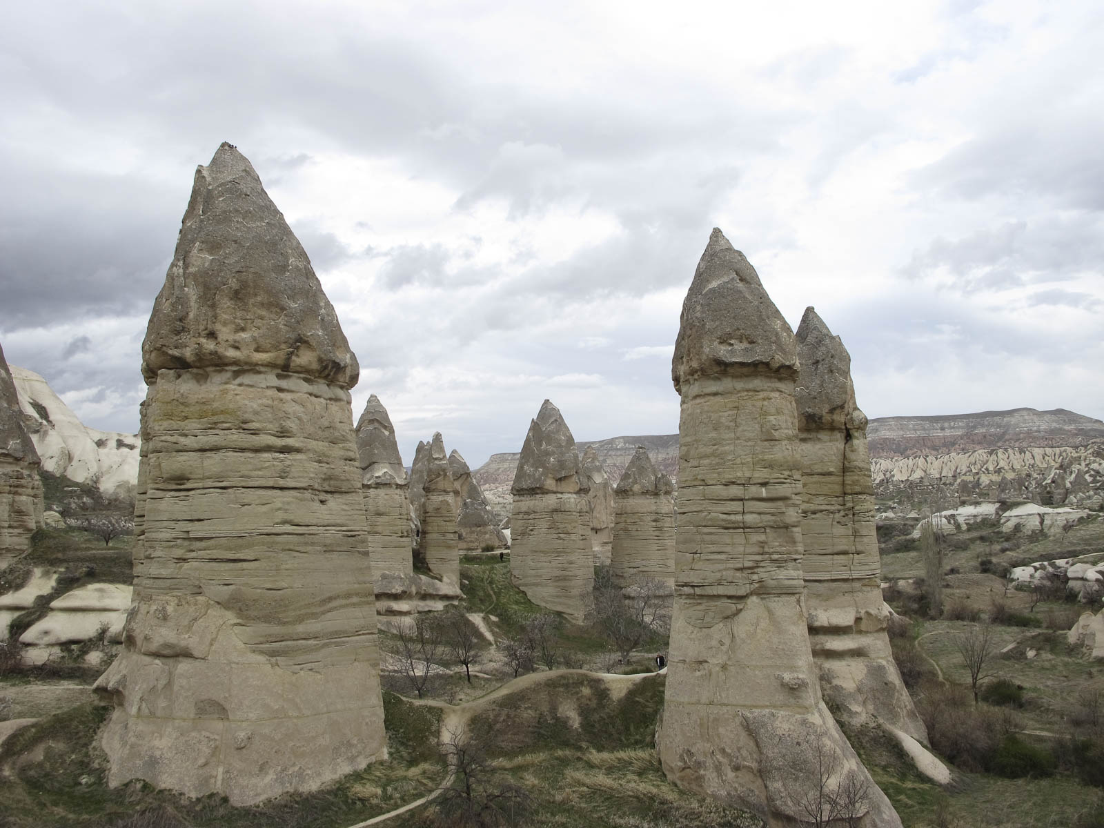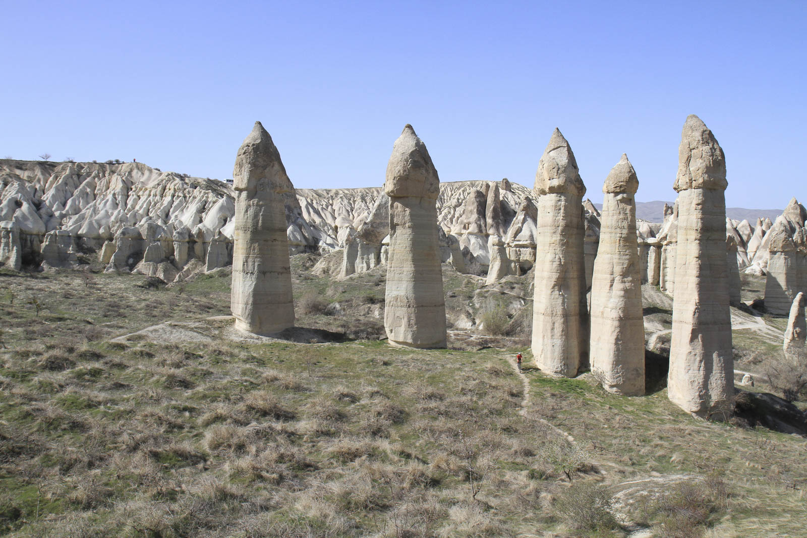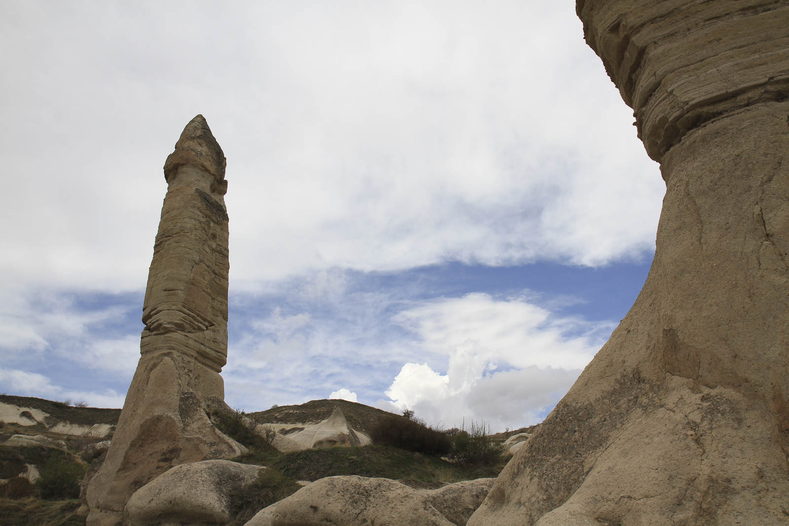 ‘I’m in a town called Cappadocia!’ zegt een Amerikaanse tourist in zijn gsm. Toegegeven, we zijn niet alleen in Cappadocië. Er lopen hier flink wat toeristen rond en blijkbaar kan niet iedereen het onderscheid maken tussen een streeknaam en/of een dorpsnaam. Als uitvalsbasis voor ons bezoek aan Cappadocië hadden we een prachtig gelocaliseerd ‘cave’-hotel in Göreme. We hadden er zicht op een feeëriek landschap dat vele millennia geleden door een vulkaanontbarsting en de nodige erosies werd gevormd. De rotsformaties zijn uniek en gevarieerd en een plezier om door te fietsen of te wandelen (of een combi van beiden aangezien wij nog al eens graag de fiets een wandelpad op sleuren). Het was er heerlijk toeven. We trakteerden onszelf bovendien nog op een ballonvaart zodat we het gebied ook vanuit de lucht in al zijn glorie konden aanschouwen.
