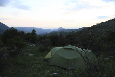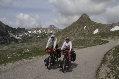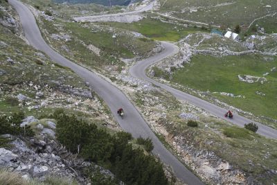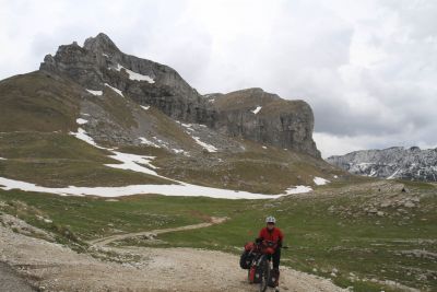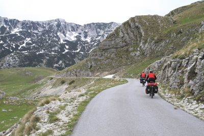 Denk nu niet: och, de sukkels, zo altijd maar in de regen fietsen. Het staat hier een beetje aangedikt, en de natuurpracht van Montenegro maakte alles goed. Want sjonge, wat is dit een mooi land. Het traject dat wij fietsten kende zijn letterlijke en figuurlijke hoogtepunt in Durmitor. Het weggetje omheen dat massief klom naar 1940 meter en was nog maar enkele dagen helemaal sneeuwvrij gemaakt. Klimmen gaat traag, maar mits geduld en flexibel zijn lukt het wel. Boven op de bergpas dronken we een zelfgestookte koffie – a coffee with a view. De zon scheen.