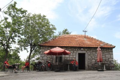 Weer wat verder in Montengro gingen we op weg naar Kolasin in een eenvoudige herberg schuilen. Een oud dametje was zo lief om de deur van de grendel te halen en de stoof aan te steken. Ze trok met haar rubberlaarzen geregeld naar buiten om extra hout te halen. Dan ging ze rustig weer zitten aan haar fornuis, en roerde ze nog eens in haar kopje, waarbij ze af en toe wat van de drab uitgoot op een schoteltje. Ze tuurde en tuurde maar in dat opdrogende koffiegrut. Na enkele uren – het bleef regenen – kwam het besje ons een wat onscherpe foto van haar zoon tonen. De hoogbejaarde waardin vroeg of Tine niet geïnteresseerd was om haar schoondochter te worden. Voor het aanzoek al te concreet werd (we zagen al een bruidsschat met een kudde schapen voor ons), stapten we maar weer op de fiets. Dat koffiedik had ons alleszins voorspeld dat het nog wel even zou regenen. Nat zouden we toch worden.