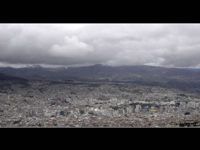 Deze morgen waren Niklaus zijn eerste woorden: “Misschien zou ik vandaag wel liever gewoon op kantoor zijn.” Bij mij zal het hiervoor toch nog iets harder moeten regenen 🙂 We bleven wachten tot 10u, maar dit bleek een zinloze onderneming, vandaag zou er in de regen gefietst worden. Alle lichaamsdelen wist ik behoorlijk tegen vocht en koude te beschermen. Alle, behalve mijn voeten. Voor het eerst op deze trip geraakten deze serieus onderkoeld. Dit koudegevoel werd echter snel weggerelativeerd toen ik een herderin blootvoets op stap zag met haar kudde schapen. Blootvoets op 4000m hoogte in de regen en bij temperaturen rond het vriespunt. Primaire levensbehoeften, ooit was dit een abstract begrip uit de lessen economie . Een tiental kilometer voor El Alto kruiste een verse wereldfietser ons pad. Het was een vrouwtje. Virginie, een bevallige Française, is solo op weg richting Alaska. Als je het mij vraagt, een behoorlijk moedige onderneming. Vanaf El Alto begon de chaos terug. Collectivo’s, bussen en taxi’s zwalpten van links naar rechts over de weg op zoek naar klanten. De zwakke weggebruiker wordt hierbij bij voorkeur genegeerd. De politie stuurde ons op een voor fietsers verboden tolweg La Paz in. Het indrukwekkend zicht op de Boliviaanse hoofdstad was goed voor de enige foto van de dag.