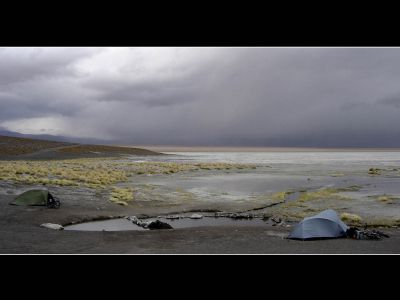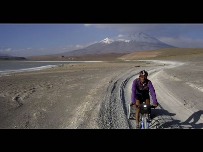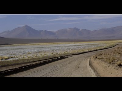 Warm was het de voorbije nacht niet op 4400 meter. Mijn slaapzak zou bescherming moet bieden tegen temperaturen tot -18 gr. Celsius maar daar heb ik ondertussen toch mijn twijfels over. Daarnaast draagt een leeglopend Thermarest-matje helaas ook niet bij aan het kampeercomfort. Niettemin, voor vandaag stond de laatste dag dirt-road en eveneens de laatste dag op Boliviaans grondgebied ingepland. Ondanks de ‘geveegde’ weg verliep het fietsen andermaal vrij moeizaam. Voor de liefhebbers die zelf ooit deze route langs de laguna’s willen fietsen, mtb-noppenbanden zijn (net als een voorraad gezond voedsel) zeer aan te raden. Voordat we onze laatste laguna’s (Verde & Blanca) te zien kregen moest we eerst nog even over een col van 4700 meter zien te geraken. De brandstof voor mijn lichaam bestond nog steeds uit koekjes, mijn verhemelte ligt er zowaar open van. De natuur verzachtte andermaal de inspanning. Na de afdaling bleken ook de laguna’s bijzonder te zijn. Toen de jeep-toeristen verdwenen waren kleurde Laguna Verde zelfs echt groen. Dankzij bijzonder nuttige route-info die we op de website van een andere ciclisto loco hadden gevonden wisten we van het bestaan van een ‘hotel’ aan Languna Blanca. Niklaus informeerde er of we toevallig geen spaghetti konden krijgen en dit bleek tot onze verbazing zelfs te kunnen. Na de spaghetti (en een liter cola) voelde ik me herboren. De laatste klim tot aan de grenspost verliep, ondanks een tegenwerkende stormwind, vrij vlot. Na Hito Cojones restte ons nog 5 kilometer dirt-road. De vicunas kwamen nog even afscheid nemen en daarna konden we over asfalt ruim 2000 hoogtemeters afdalen tot in San Pedro de Atacame. Helaas had ik mijn achterband de voorbije dagen blijkbaar aan flarden gereden. Met enkele scheurtjes aan de velgrand leek me een rustige afdaling geen onverstandige keuze. In San Pedro de Atacame moesten we nog de Chileense grensformaliteiten vervullen. Voor het eerst op mijn trip verliepen deze niet bijzonder vlot. Groenten- en fruitcontrole inclusief spendeerden we er ruim een uur.