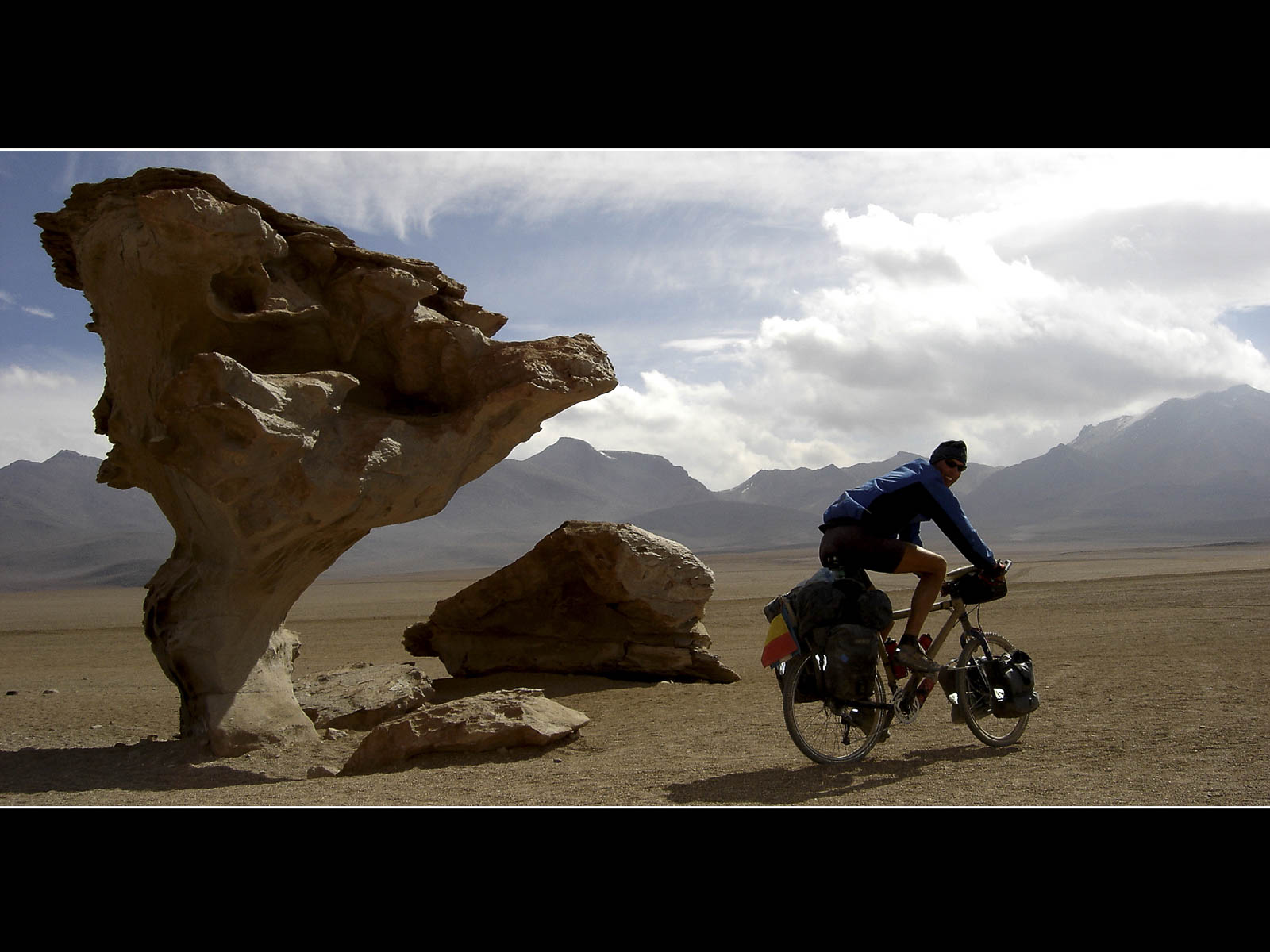 Na een laatste blik over Laguna Hedionda geworpen te hebben was ik klaar voor een nieuwe dag hard labeur op de fiets, althans dat hoopte ik. We klommen op een nog steeds bijzonder slechte ‘weg’ tot een hoogte van 4700 meter. Het landschap was uniek, bergen en meren in gevarieerde schakeringen kleurden de woestijnomgeving. 13u, lunchtijd. Er stond 38 km op de teller en dat terwijl we al meer dan 4u30min stevig hadden getrapt. Het washboard wegdek was nu eens met stenen bezaaid, dan eens met zand overgoten. Geen enkele mogelijkheid dat een beladen fiets ook maar één centimeter uit zichzelf bolde. Vandaag Laguna Colorado bereiken leek onhaalbaar. Na de middag kwamen we echter op een geprepareerde weg terecht, dit bleek een serieuze verbetering. Ik noteerde tijdens een afdaling zowaar een maximum snelheid van 19 km/u. Anderhalf uur later stonden we 20 km verder. We konden er de Arbol de Piedra aanschouwen, een door de natuur tot boom gesculpteerde steen. Ook de volgende kilometers bleken over ‘geveegd’ wegdek te verlopen. Daardoor bereikten we uiteindelijk toch Laguna Colorado. Het camponomiento was eerder basic, maar bood niettemin meer weerstand tegen wind en koude dan onze tent. We troffen er ook de meeste van de toeristen aan die ons vandaag – vriendelijk zwaaiend – per 4×4 waren voorbijgereden. Ons fietstochtje wekte verbazing en ongeloof. Wat de plaatselijke bevolking betreft? Wel de voorbije dagen kwamen we onderweg, behalve de flamingo’s en jeep-toeristen, nog weinig levende wezens tegen. Het sublieme laguna-gebied in Zuid-Bolivië is ongeveer even groot als Belgiëmaar helaas is (drinkbaar) water er niet voorhanden, meteen de verklaring voor de afwezigheid van vaste bewoners.