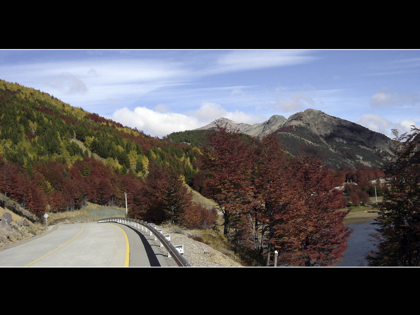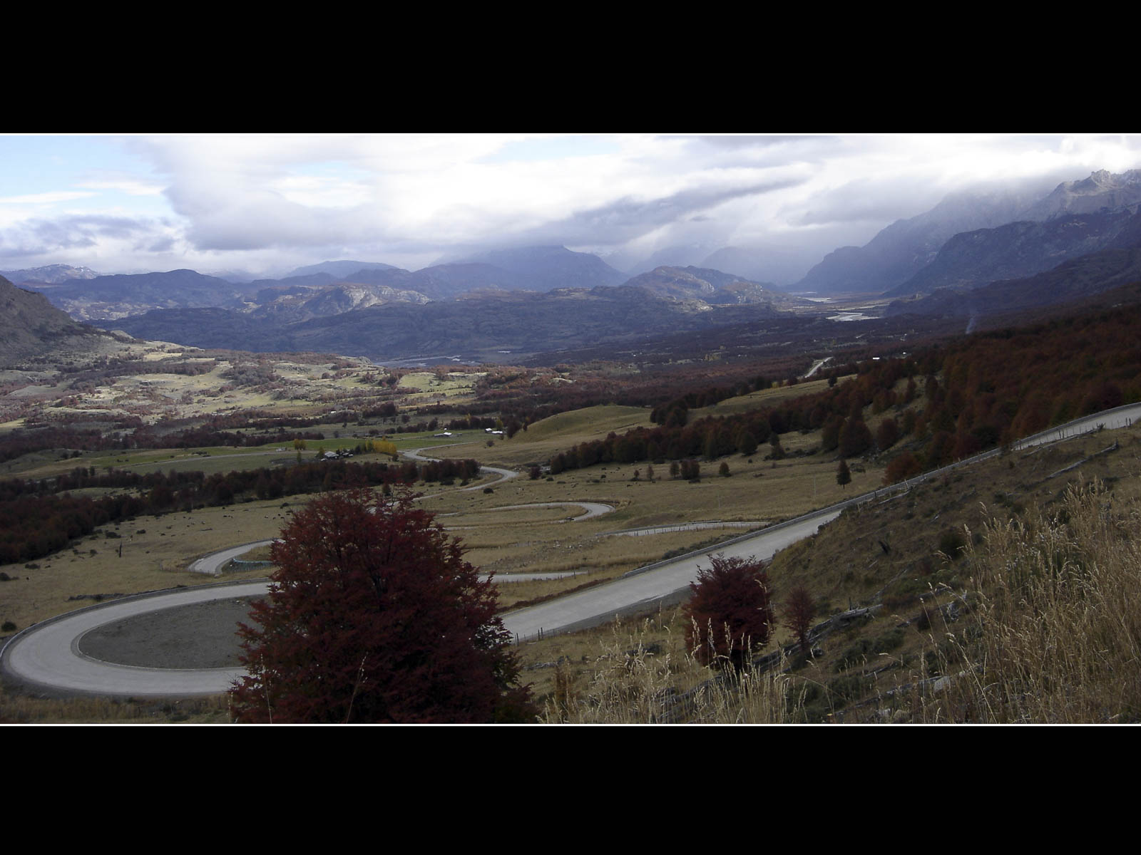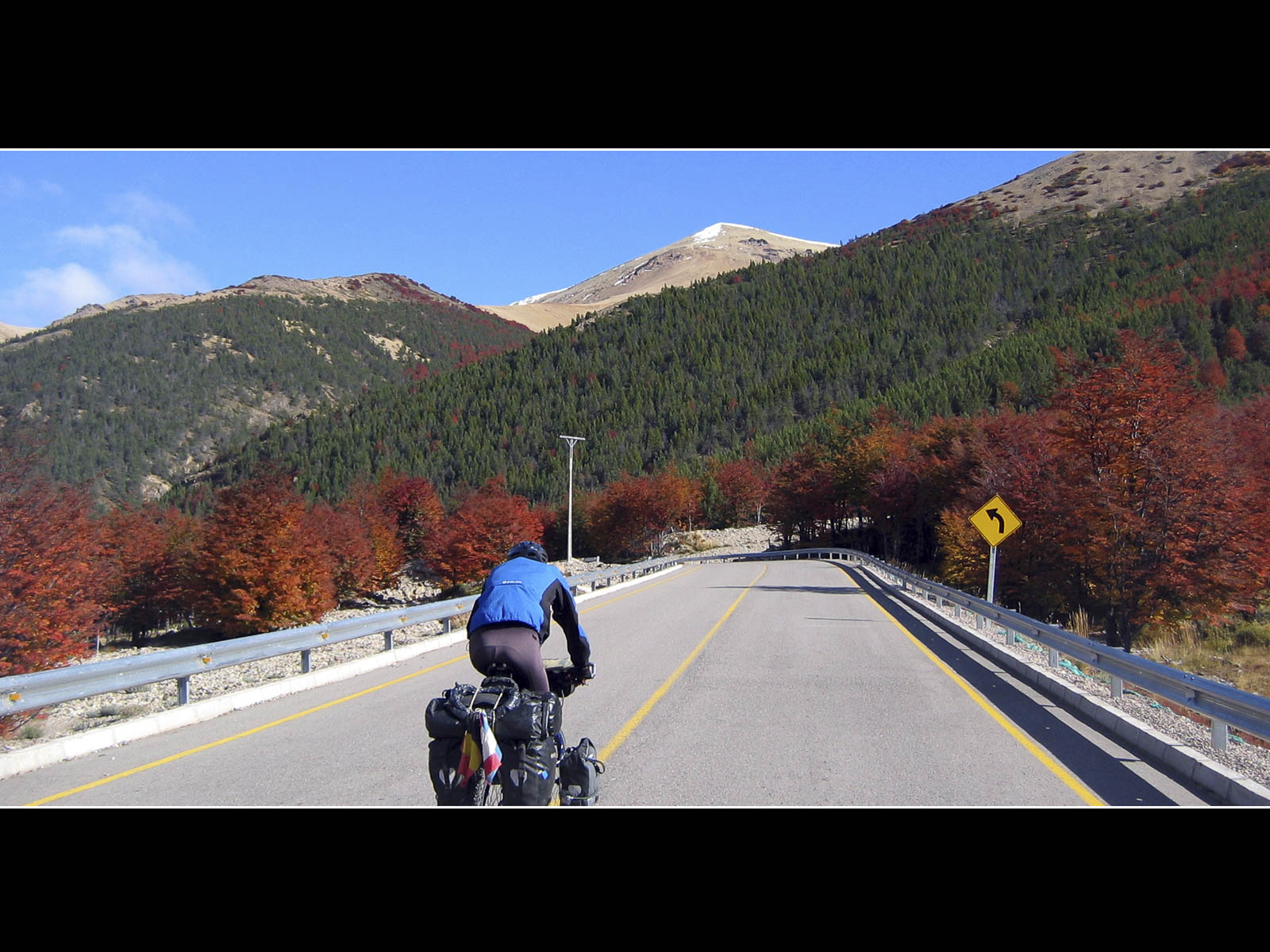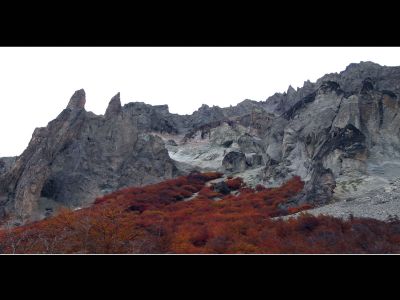 De dag werd met een glimlach gestart, ik zag vanuit mijn bed een wolkenloze helblauwe hemel. Voor vandaag stonden onze laatste kilometers over de Carretera Austral ingepland. De – hier nog steeds geasfalteerde – Carretera voerde ons doorheen het Reserva National Cerro Castillo. De omgeving was in bijzonder gezellige herfsttinten gehuld, het was er mooi fietsen tussen de koperrode, olijfgroene en goudgele bomen. De lunch moesten we, wegens te koud, vervroegd afbreken. Ik poogde me te herinneren wanneer we voor het laatst, wegens te warm, tijdens de lunchpauze de schaduw hadden opgezocht. Na 90 kilometer kwamen we bovenop Portezuelo del Diablo te staan, de (lichtlopende) col van 1130 meter was normaliter mijn laatste verblijf boven de 1000 meter van deze trip. Tijdens de afdaling – nu met helm – deed ik nog een ultieme poging om mijn snelheidsrecord scherper te stellen, ik bleef helaas steken op 76 km/u. Even verderop vervolgde de Carretera Austral zijn weg richting Villa O’Higgens. Wij namen, met enige spijt in het hart maar noodgewongen wegens geen ferries verderop, de afslag naar Puerto Ibanez. Op de dirt-road kon ik tot mijn tevredenheid vaststellen dat het comfortabel fietsen was met mijn nieuwe ProTrack-achterband. Na 30 kilometer hoofdzakelijk afdalen bereikten we lago General Carrera (zoals de Chilenen het noemen) ofte Lago Buenos Aires (zoals de Argentijnen het noemen). De streek rondom het meer zou van een warm zonnig microklimaat genieten, maar toen wij er aankwamen zat de zon al terug enkele uren achter een dreigend wolkendek verscholen.