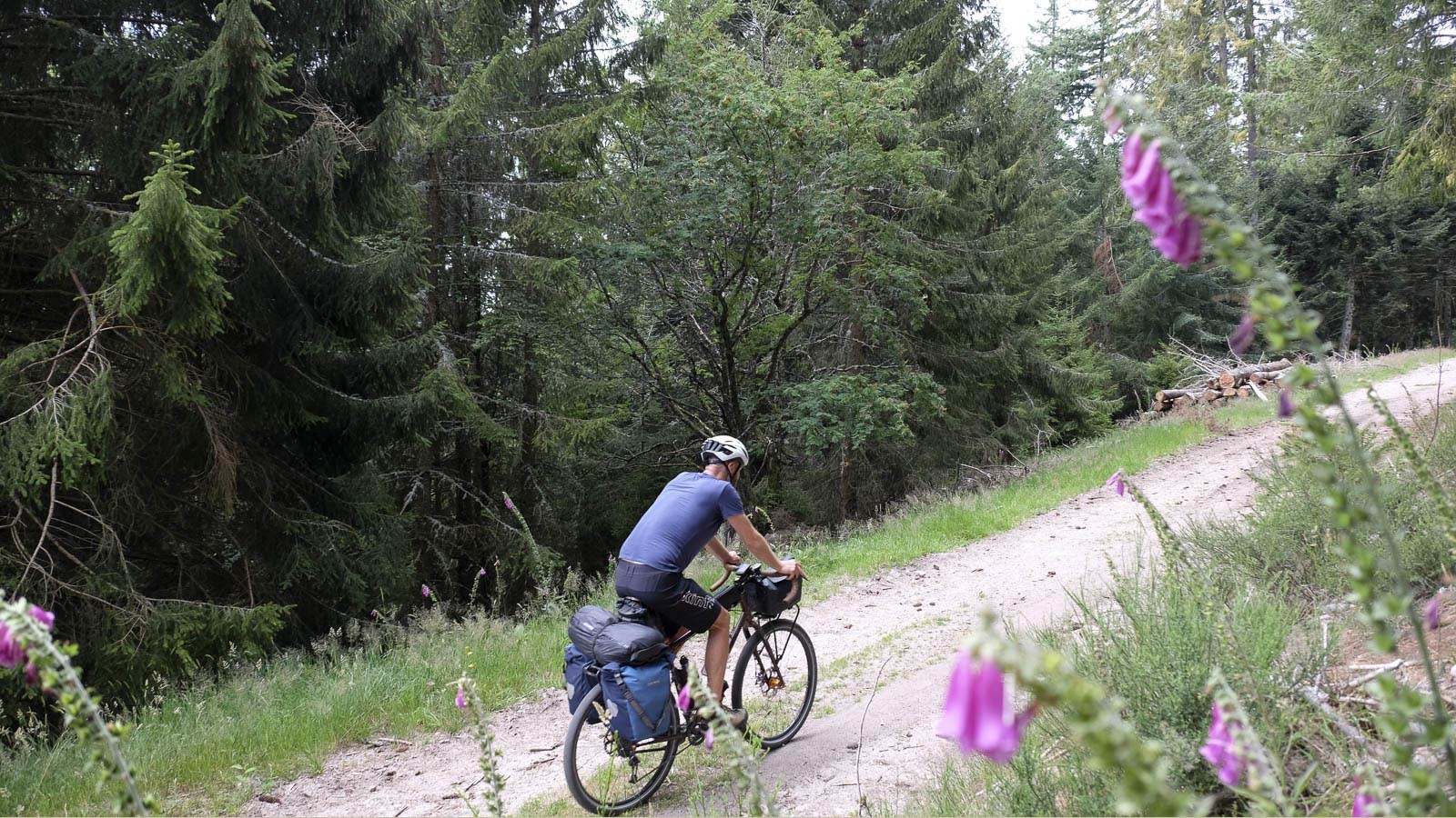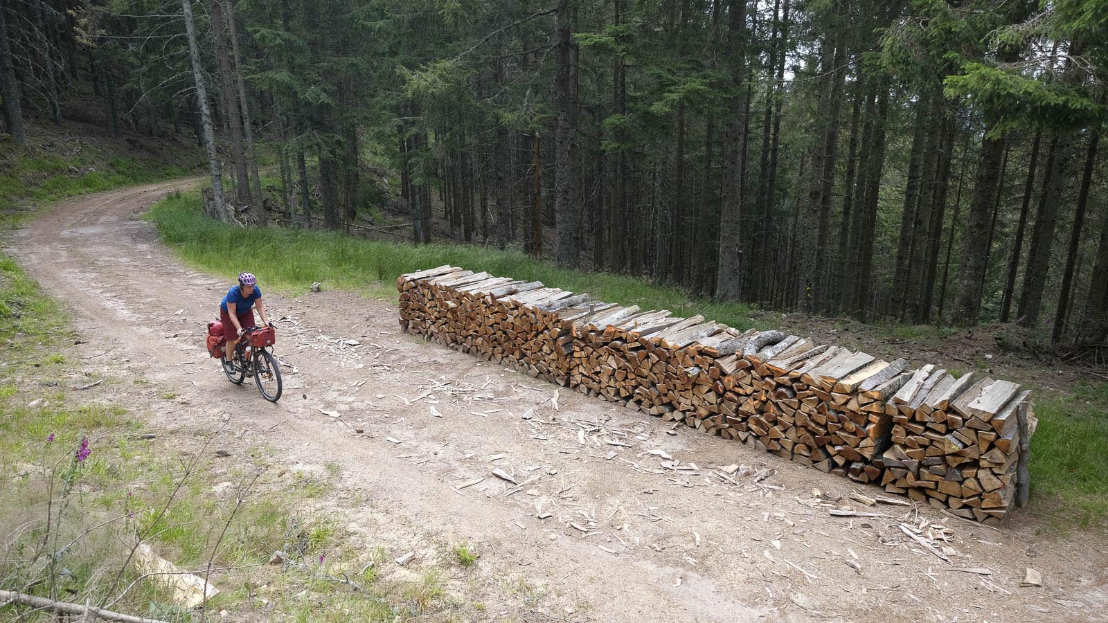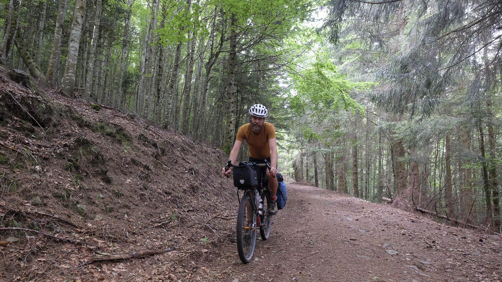 Ook de ondergrond is gevarieerd: brede woudroutes al dan niet bezaaid met grote of kleine stenen, singletracks door het gras of onder de dennennaalden verstopte bospaden. Mede daardoor vorderen we traag en onze gemiddelde snelheden vertonen een dalende trend. Maar zelfs met volle bepakking zijn de “hike & bike”-passages beperkt.