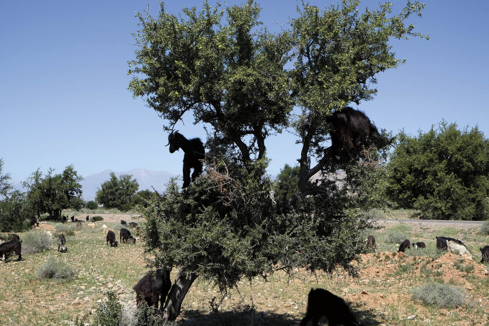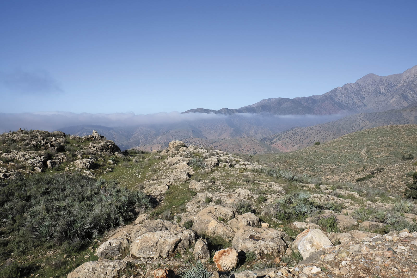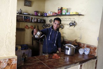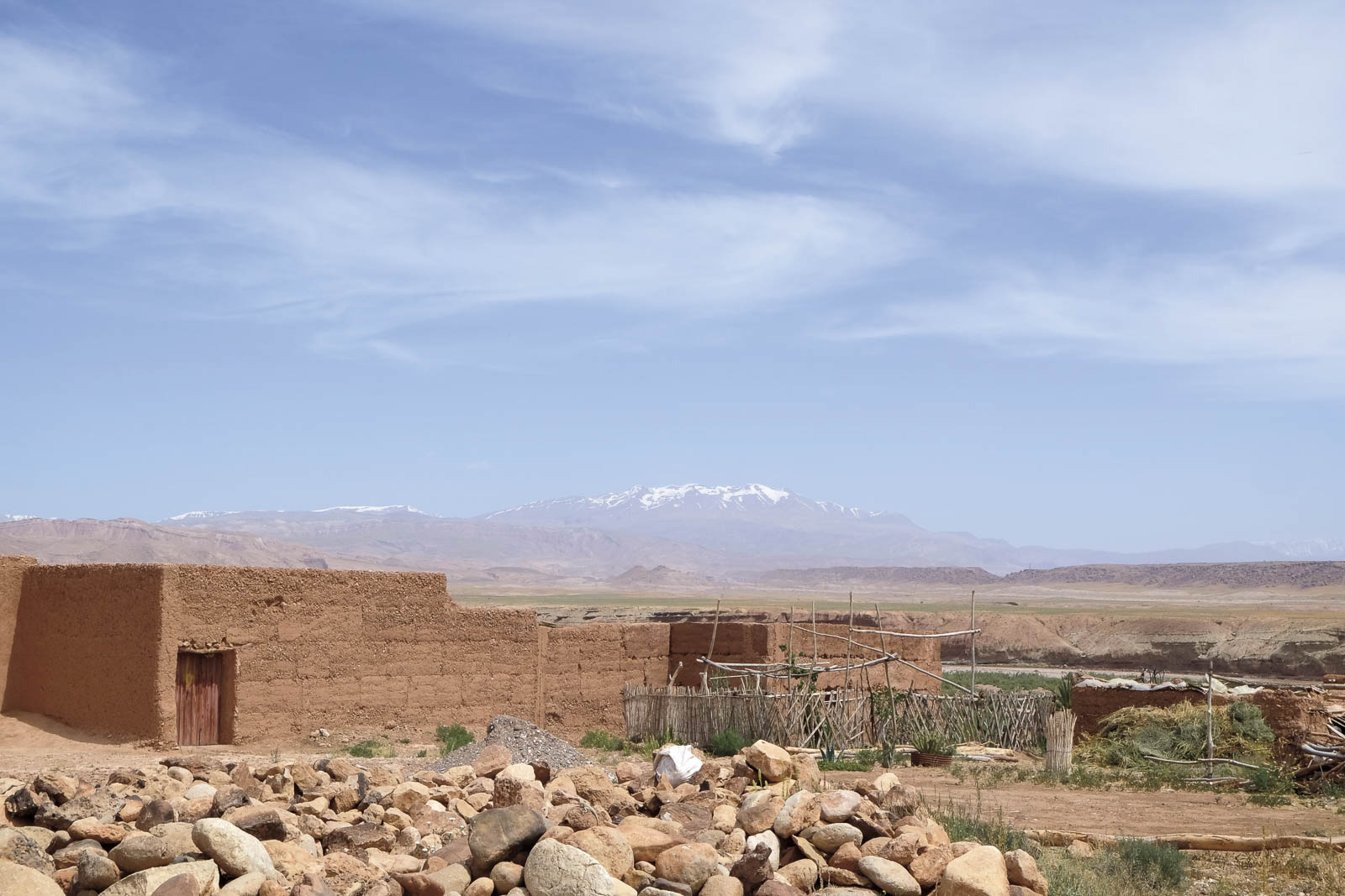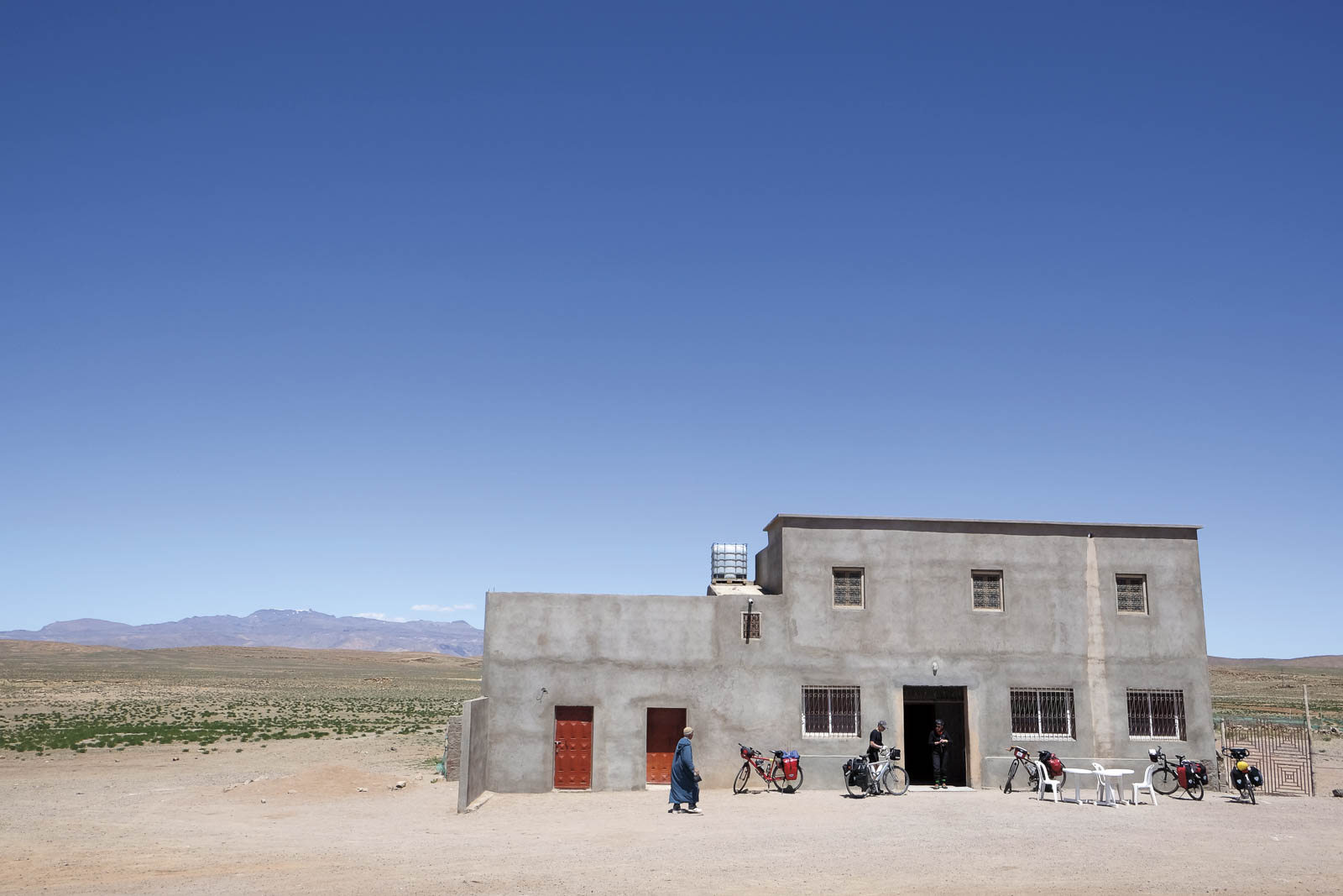 Is dit een fata morgana of zien we daar echt een cafeetje glinsteren in de zon? De weg klimt heel langzaam, het is broeiend heet, de besneeuwde toppen van de Hoge Atlas schitteren in de verte, voor de rest worden we omringd door een droog en dor landschap. Jawel, we zien het juist, een cafeetje in de middle of nowhere. Dorstig en hongerig vragen we de man wat hij te bieden heeft: omelet Berbère met brood. Top. Heeft hij ook een pintje in de aanbieding? Neen, maar wel een whisky Berbère. Ook top.