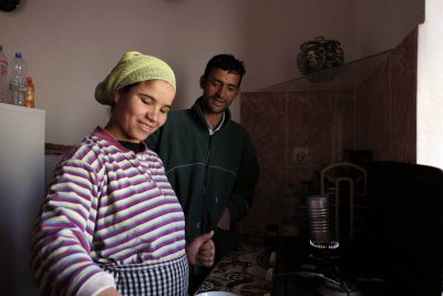 Hier is Omar: doordat zijn zoon in panne stond langs de kant van de weg kwamen we bij deze brave mens terecht. Hij bood ons prompt een lunch aan van muntthee en heerlijke omelet Berbère. De aap kwam echter al vrij snel uit de spreekwoordelijke mouw: zijn vrouw, dochters, schoondochters, kleindochters zijn een voor een specialisten in het weven van tapijten. Voor we het goed en wel beseften (en in afwachting van de omelet Berbère) toonde hij allerhande tapijten en jawel, Wim (die thuis een gedetailleerde Excel bijhoudt met het aantal grammen van elk item dat we mee hebben) kan na amper vijf dagen Marokko een tapijt van om en bij de drie kilogram op zijn achterdrager binden om die over de hoge Atlas mee naar Marrakech te nemen.