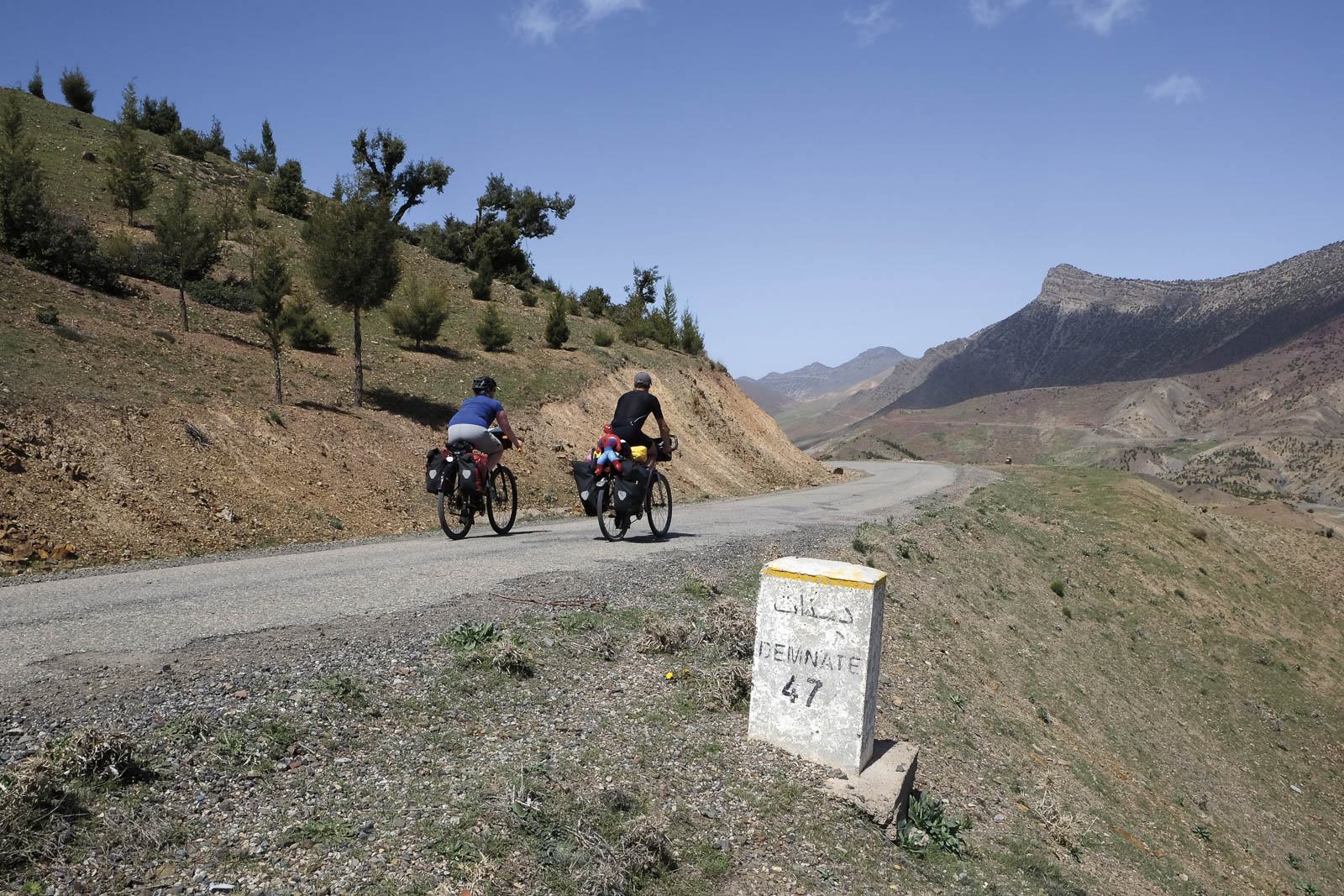Om de Atlas te traverseren moeten er tizi’s (oftewel Marokkaanse cols) bedwongen worden. De eerste tizi, de Tizi ‘n Test (2.090 meter), was uiterst geschikt om de voorjaarsconditie te testen (what’s in a name). We hadden geluk, de Fransen hebben destijds voor een aangenaam stijgingspercentage gezorgd (kwestie dat de col ook haalbaar was voor de mannen van het Vreemdelingenlegioen). Na nog vier tizi’s kwamen we in gortdroge landschappen terecht. De Sahara was in Agdz niet zo veraf meer maar een strakke tegenwind en een supergezellige Kashbah zorgden ervoor dat we niet veel dichter kwamen. De groene oases langs de Drâa waren bijzonder charmant, de levensomstandigheden in de idyllisch gelegen dorpjes waren dit iets minder.