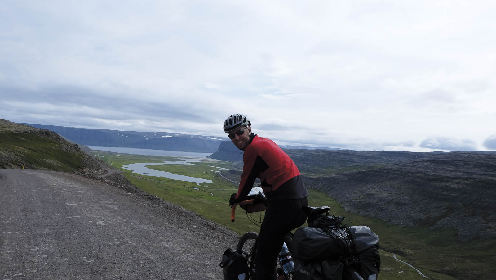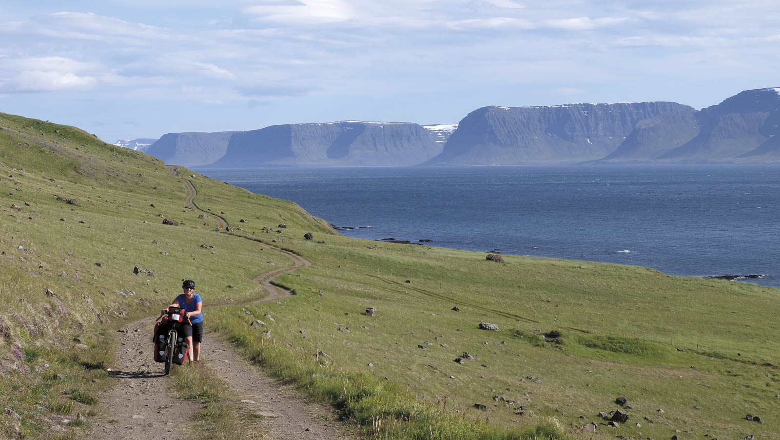 Daarna volgden we de onverharde weg 60 naar de Dynjandi waterval. Onderweg stopten we voor een koffie in Bildudalur. De zon scheen en het was vrij warm. De IJslandse medemens reageerde meteen: topjes werden uit de kast gehaald en de ijsjes gingen vlot over de toonbank. Het was al bij al toch 13°C. Wij stonden erbij en keken ernaar. Om ons toertje in de Westfjorden af te ronden reden we nog eens helemaal langs een fjord, via weg 622 naar Þingeyri. Het was er lastig fietsen, maar echt fantastisch: nauwelijks verkeer, we fietsten helemaal onder kliffen, hadden zicht op de blauwe oceaan en steile bergen naast ons. Als toemaatje konden we ook kennismaken met de voor fietsers beruchte rivieroversteken, koud aan de voeten, dat in elk geval.