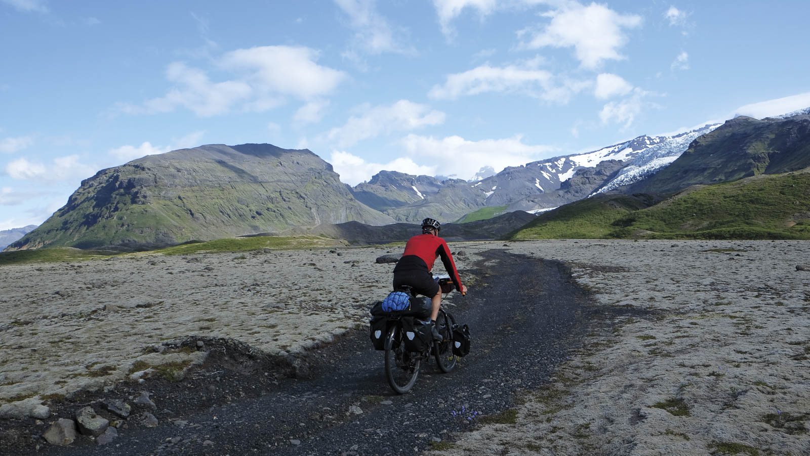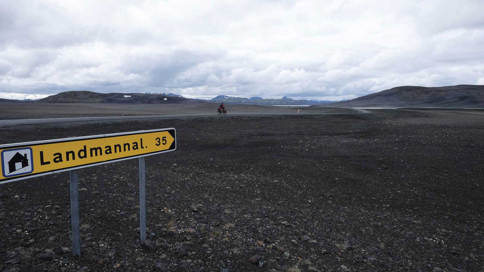 De meest bekende weg in IJsland is de ringweg die sinds 1974 helemaal rond het eiland loopt en geasfalteerd is. Veel leuker voor fietsers zijn echter de wegen die het binnenland doorkruisen. De F35 of de Kjolurroute is er een van. Het is de kortste weg van noord naar zuid. De voorspelde noordenwind was in die dagen een betrouwbare metgezel en in plaats van de verwachte vier dagen klaarden we de klus in twee dagen. Het binnenland van IJsland krijgt de naam ‘highlands’ en ook al fietsten we op ‘amper’ 500m, toch bleek de naam niet gestolen. We fietsten er met zicht op de gletsjers Hofsjökull en Langjökull en kampeerden in Hveravellir waar we na een lange dag konden opwarmen in een warmwaterbron.