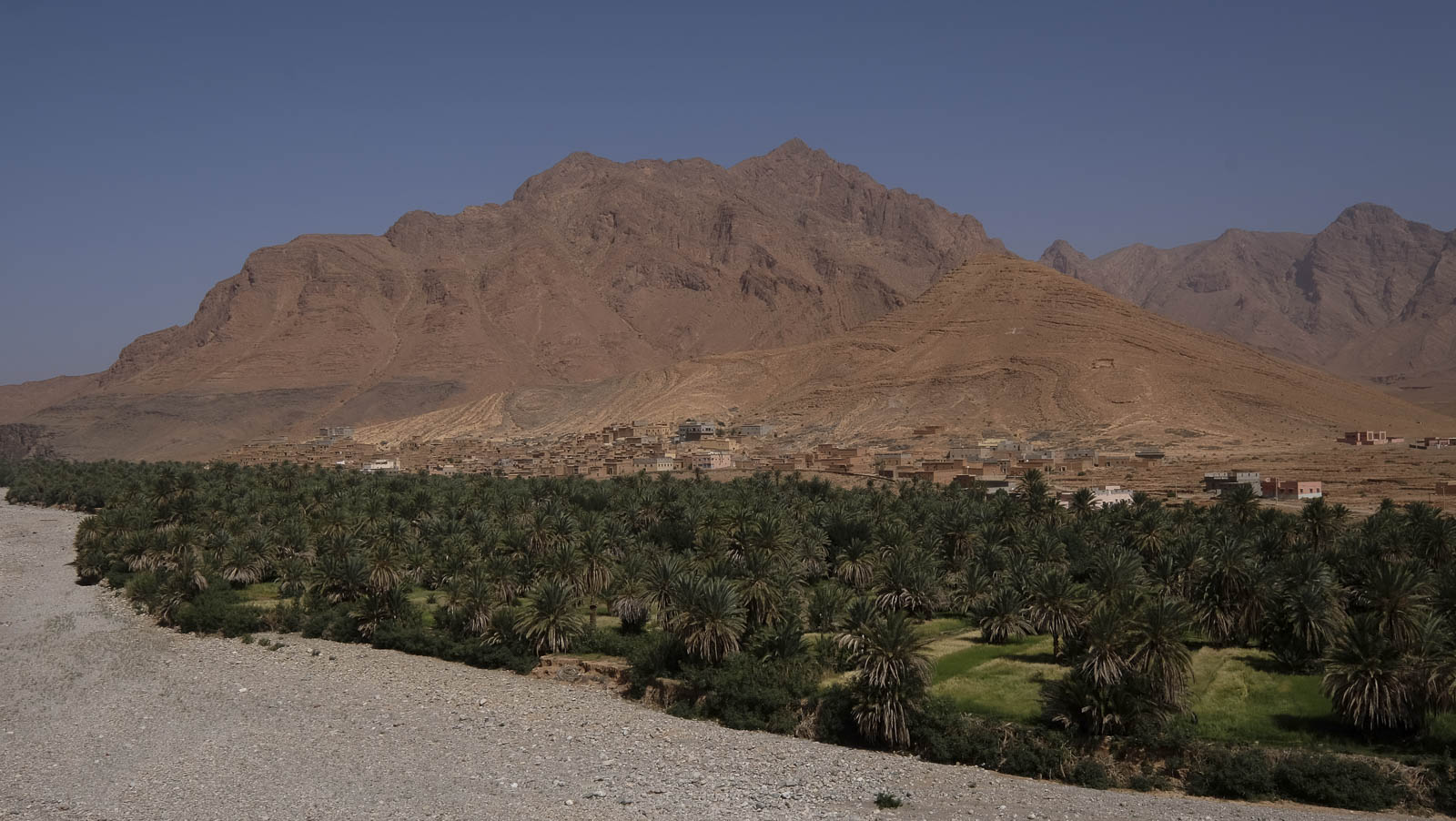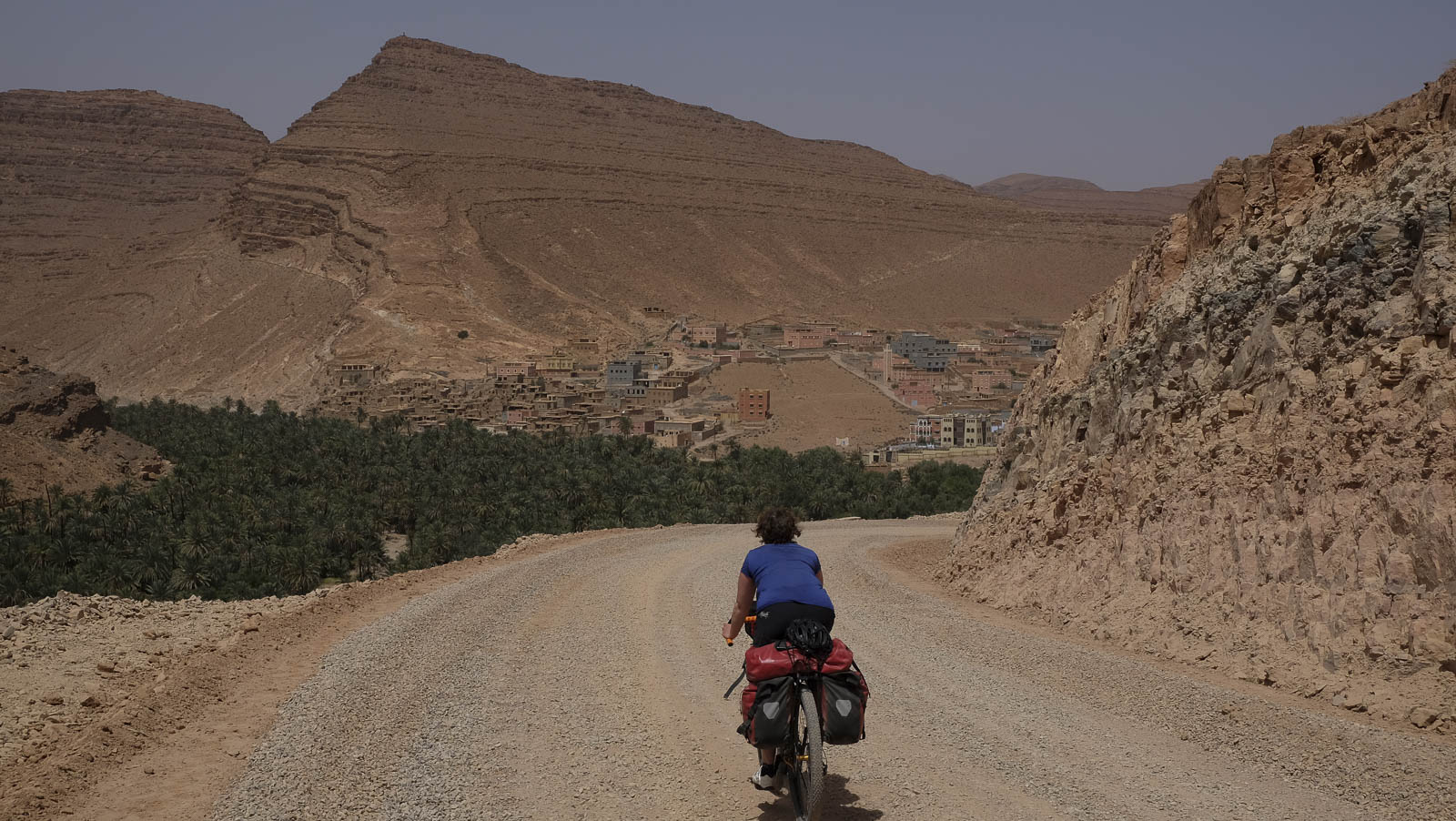 Igrim ligt in een oase, wat gewrongen in de kloof. Het is een onwaarschijnlijk mooi gelegen pittoresk berberdorp. Helaas blijkt de al kilometers geleden aangekondigde auberge gesloten zodat we geen frisse cola kunnen drinken. Gelukkig biedt de schaduw van de palmeraie soelaas. En ook het water smaakt heerlijk koel. Om uit Igrim weg te raken, krijgen we een stevige klim voorgeschoteld. Het is een kwestie van op strategische punten even op adem te komen zodat we op de steile helling opnieuw kunnen vertrekken.