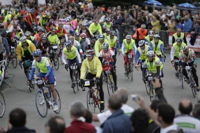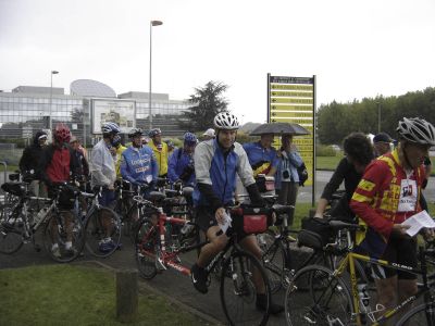 Luid aangemoedigd door enthousiaste Parisiens vertrekken we om 21u tandemgewijs voor onze aller-retour naar Brest in een bont allegaartje van rijtuigen gaande van triplettes, tricycles, ligfietsen, pistefietsen tot vehikels uit het begin van de vorige eeuw. In ons fluojasje en regenvestje (ja, beste lezer, het miezert een beetje) zijn we er helemaal klaar voor.