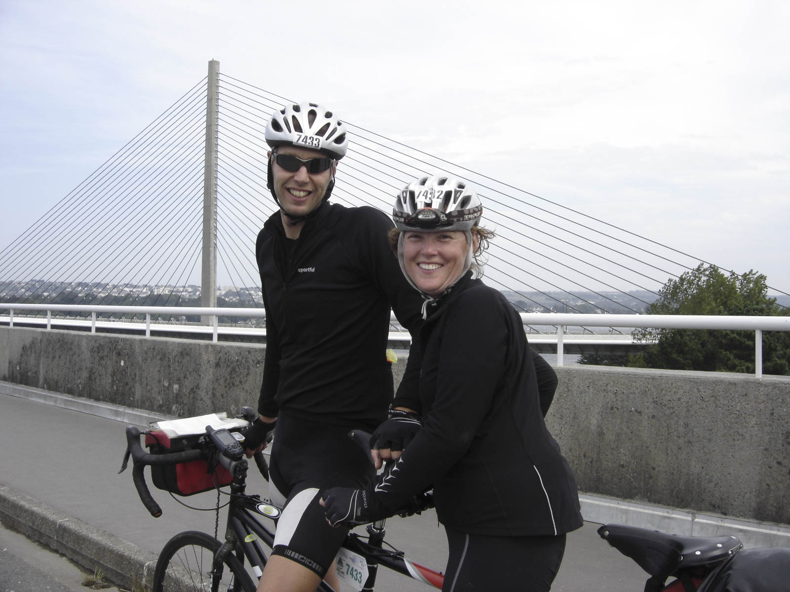 Nadat we het hoogste punt van Bretagne overwonnen hebben, gaat het in sneltreinvaart richting Brest. We traverseren een fotogenieke brug en bereiken het keerpunt van onze trip: 613km gereden, 613km te gaan, het wordt zowaar overzichtelijk. Tijdens de controle blijkt dat het vooropgestelde tijdschema wederom te ambitieus is opgesteld. Maar niet getreurd, de zon is nog steeds van de partij.