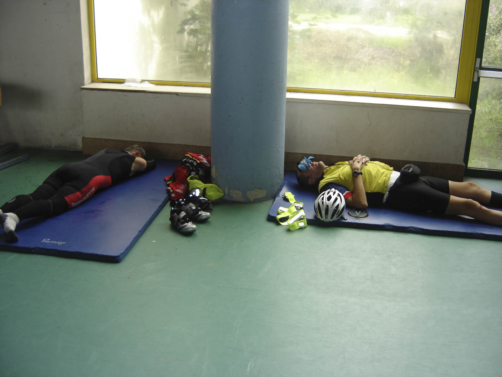Na anderhalf uur worden we getrakteerd op vers daglicht en een geheime controle. Wim neemt er voor de eerste keer een power nap, 15 minuten in dromenland. Uitgeslapen en opgewekt stapt hij terug op de fiets.