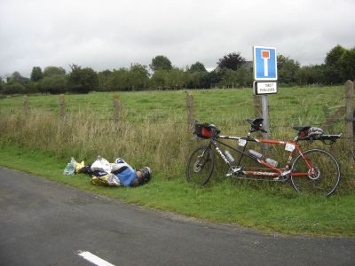 Vanaf Carhaix is het terug gezellig toeven in het gezelschap van de Belgische randonneurs. Het weer wordt zowaar nog enthousiaster, bijgevolg spelen we mouw- en beenstukken een eerste keer uit. Dit zal later een uniek manoeuvre blijken te zijn. Op een aflopend stuk nemen we het peloton nog eens op sleeptouw. Helaas krijgen we vrij snel een nieuwe slepende helling gepresenteerd: 10km aan 4%, meer moet dat niet zijn voor een tandem en zijn berijders.