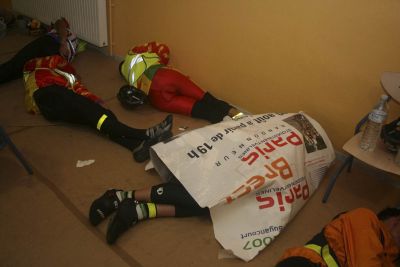 Na een gesmaakte spaghetti in een dynamische controlepost (elk oponthoud betekent immers minder slaap) zetten we koers richting Mortagne en een laatste slaapplaats. De wegen richting Parijs worden in het donker opgeschrikt door honderden fluovestjes, voor- en achterlichtjes. Hier geen loos gebabbel meer, maar een stil gevecht met de eigen gedachten.