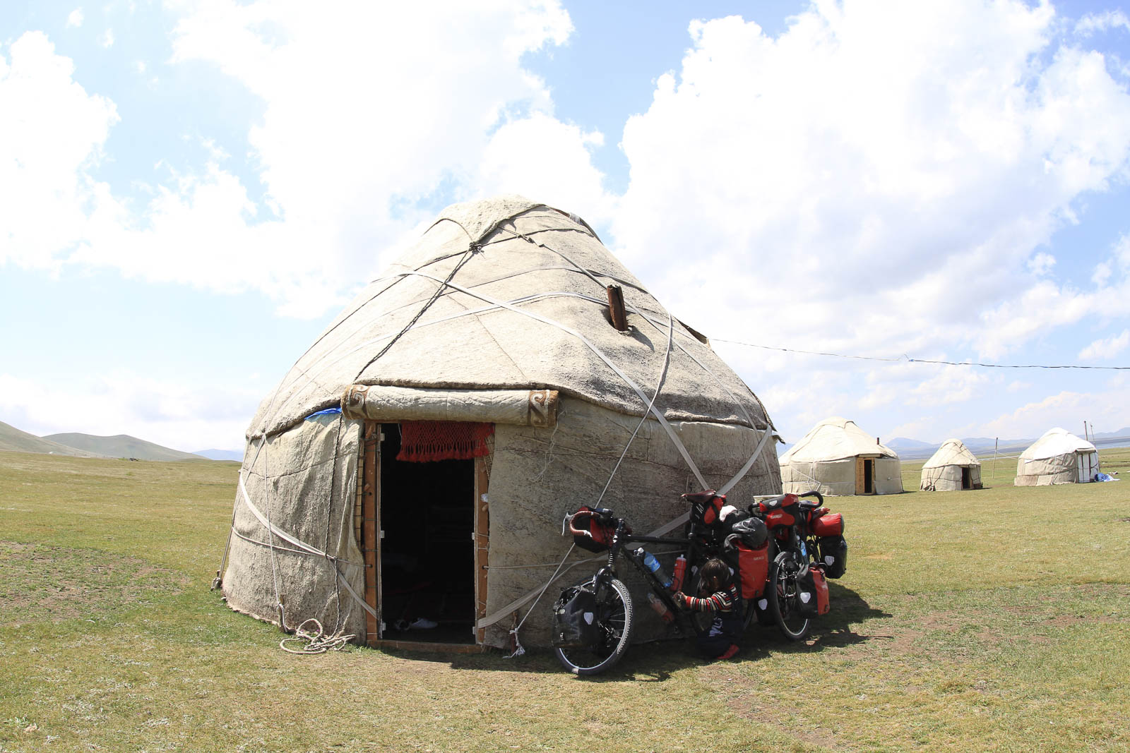 We hadden een overnachting in een yurt geregeld via CBT (Community Based Tourism). Deze organisatie is actief in heel Kirgizië en zorgt ervoor dat inkomsten uit het toerisme bij de lokale bevolking terechtkomen. Het verblijf is een voltreffer. Niet alleen worden onze magen gevuld, maar we maken ook kennis met het authentieke nomadenleven. Diverse fotorolletjes worden volgeschoten. Onze gastheer maakt heel enthousiast een ritje op onze fiets, wij iets minder op zijn paard. Het werd een memorabele avond.