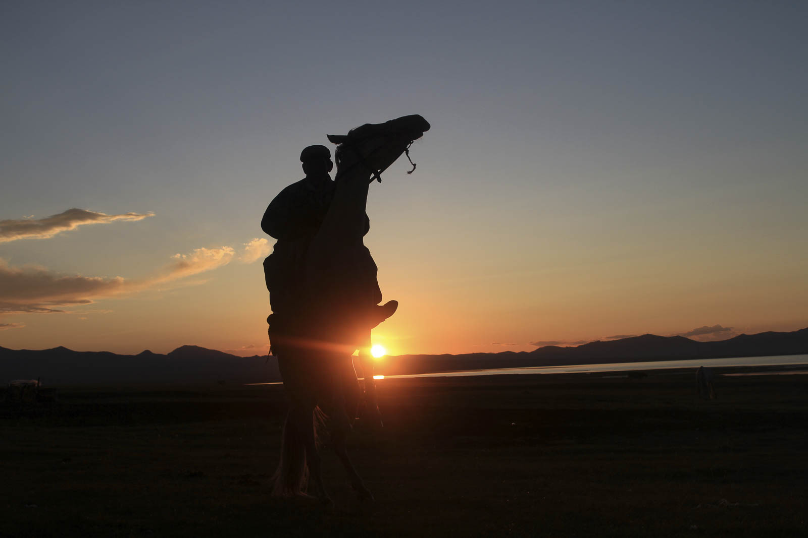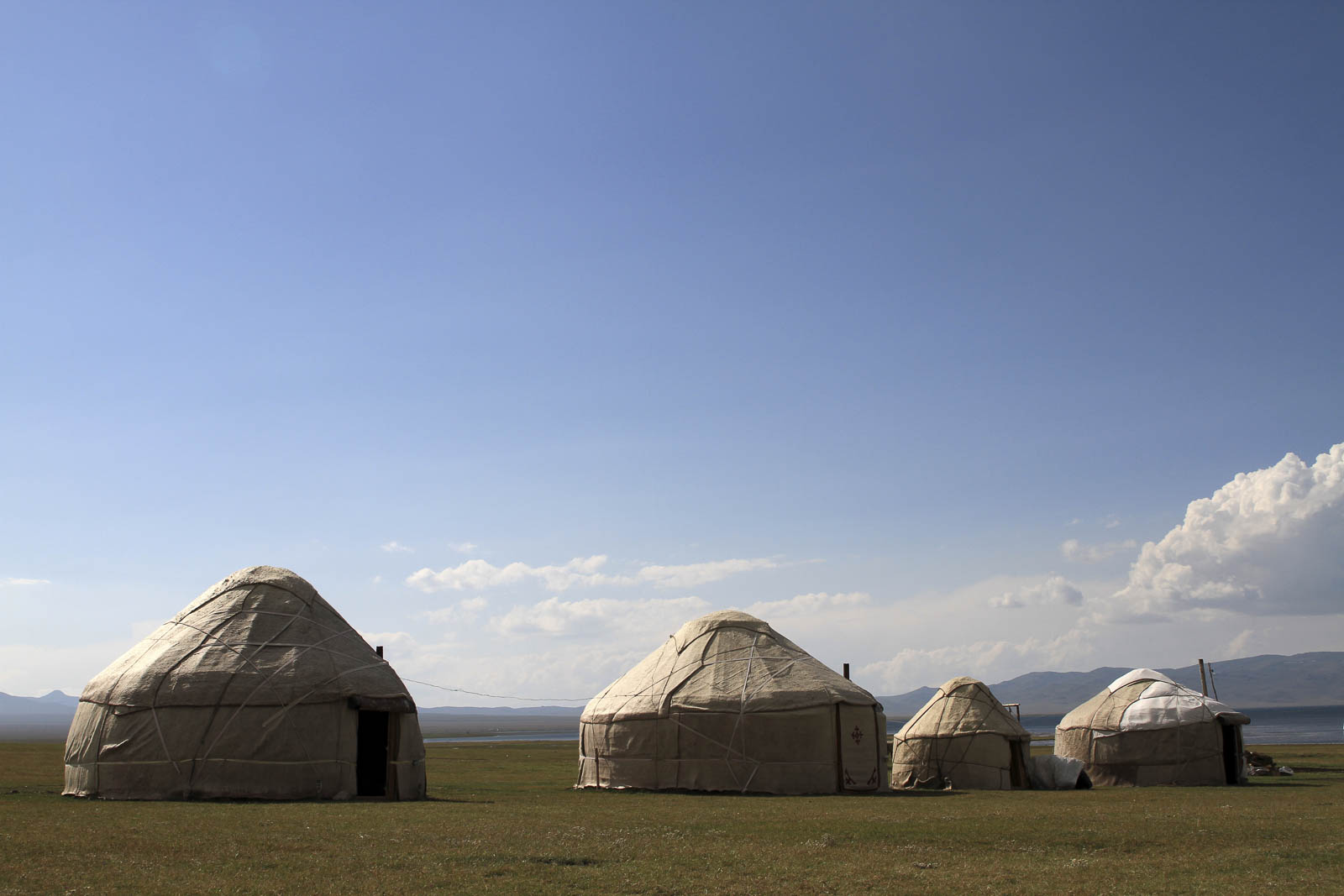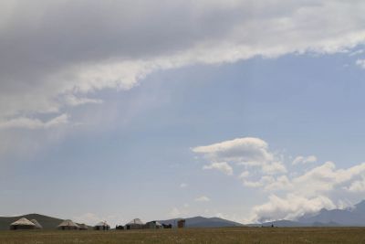 De eigenlijke beklimming naar Song Kul gaat over 30 haarspeldbochten waarbij ruim 1000 hoogtemeters moesten overwonnen worden, de col bevindt zich op 3244m. Na vier uur fietsen haalden we een gemiddelde van 6,3km/u met een maximum snelheid van zowaar 12 km/u. Eenmaal boven gaan de hemelsluizen open, sneeuwregen zorgde ervoor dat we op zoek moesten naar onze winterhandschoenen. De bui blijkt gelukkig van tijdelijke aard. Het landschap dat zich voor ons opent, is werkelijk adembenemend: yurts, paarden, het meer Song Kul met een bergmassief op de achtergrond.
